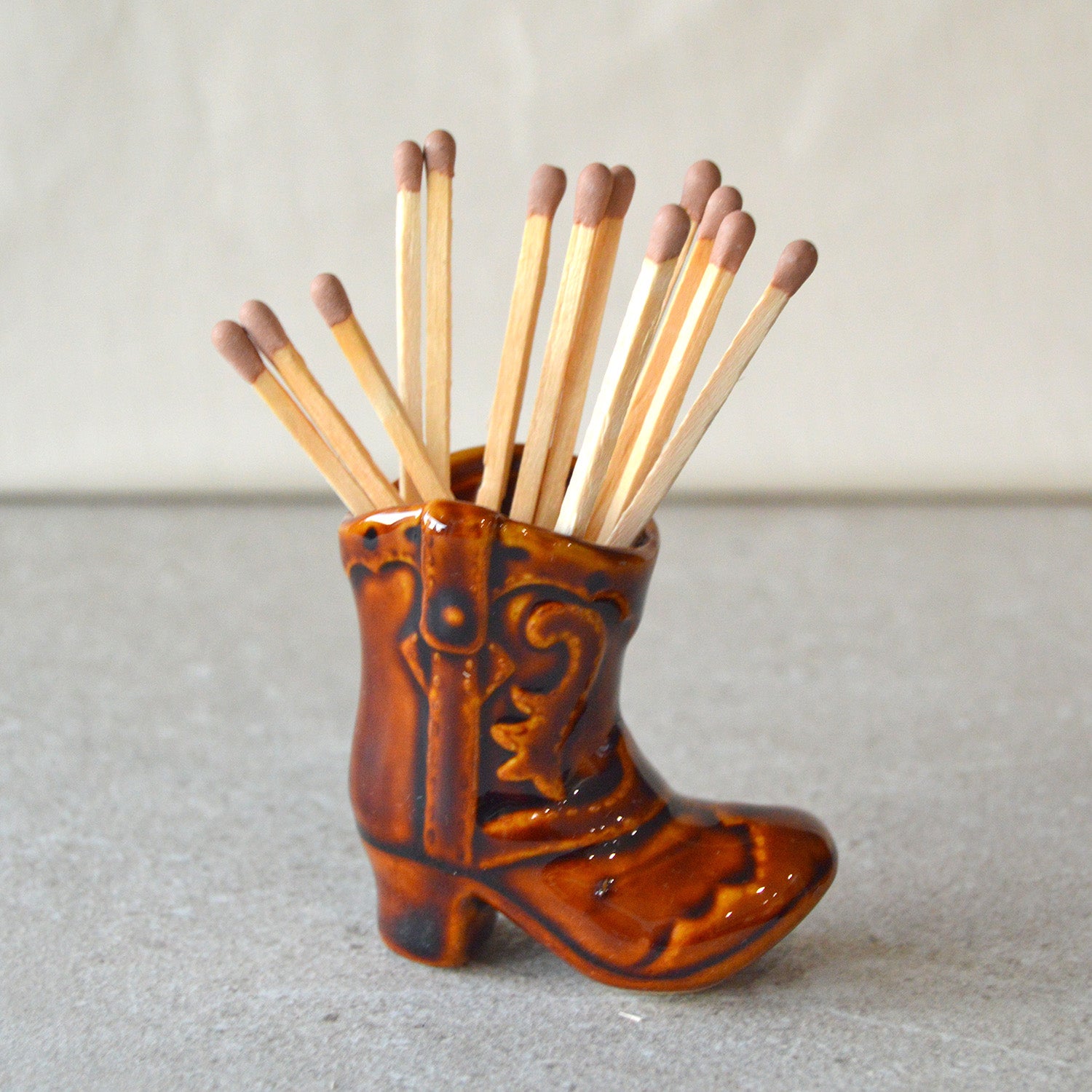 Explore the retro charm of our vintage and up-cycled matchstick holders and add a dash of nostalgia and style to your space. Each unique holder comes with elegant matches and a striker, adding both style and functionality to your decor.
