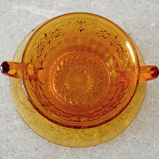 Indiana Glass Co. Amber Daisy Pattern Cream Soup Bowl and Saucer