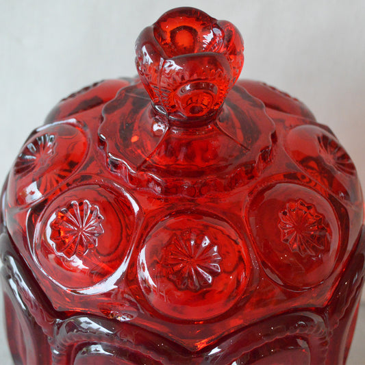 Vintage LE Smith Red Amberina Moon and Stars Footed Candy jar with Lid (1950s)