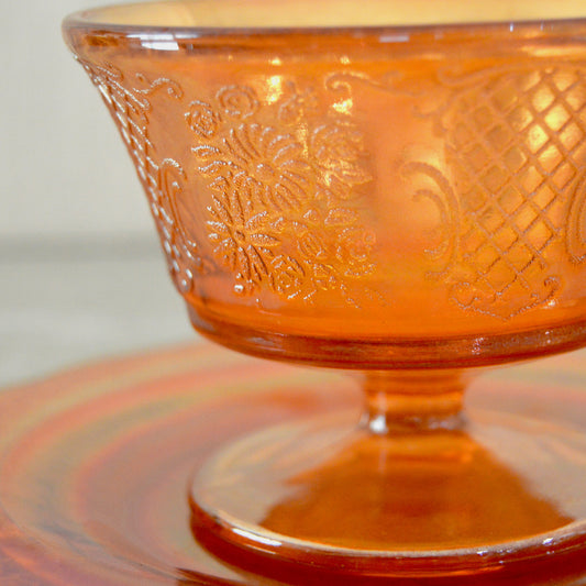 Vintage Floral Federal Glass Normandie Iridescent Marigold Carnival Glass Dessert Cup with Saucer (1940s)
